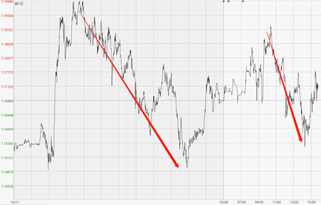 今天早上也出现了一轮下跌,跌至7.19附近,但午后再次出现上涨,涨到了7.15。
