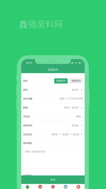 鑫强废料网app是一款二手废品一手货源交易平台,专为本地老百姓所开发的废旧物资,再生资源换钱的移动商城,可以免费发布求购或者卖货信息,合理对接交易者进行撮合式交易,全程受官方实时监控,每个细节都有检测,保证物品的品质,与价格的合理,交易双方都有不错的体验感,同时,还可下单预约上门回收,足不出户回收闲置物品才是真的便民,尽在鑫强废料网!