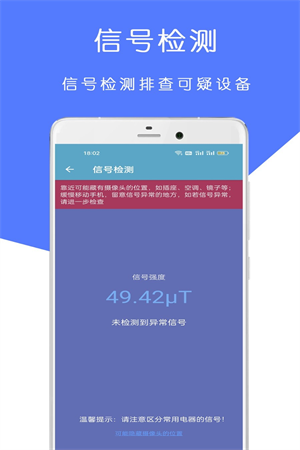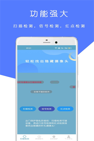 1、可以自动检测环境中是否存在隐私摄像头,如果有则会发出警报,给用户更好的安全保护使用。