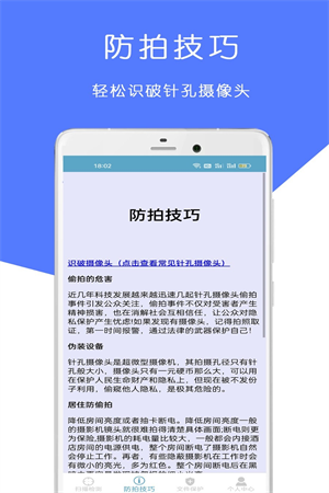 摄像头防偷拍检测app是非常神奇的安全保护的软件,可以帮助你及时发现环境中的隐私摄像头,保护我的隐私安全。手机的操作简单易用,没有任何的复杂的技巧,支持用户进行随时的检测进行安全守护。