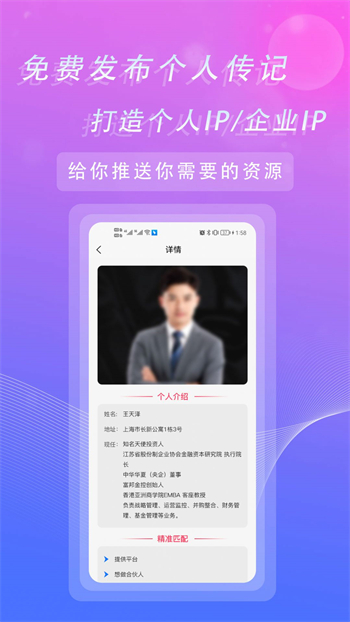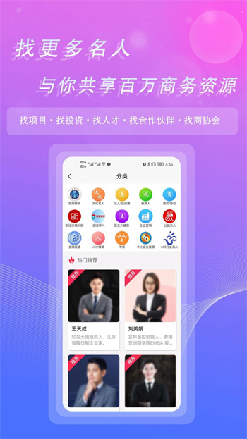 在当今商业社会中,资源对接非常重要,尤其是对于商务人士来说更是如此,为了方便商务人士的资源对接,对接名人app就非常不错,对于有这方面需求的你,欢迎免费来这下载吧!
