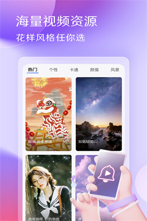2、提供了数千款独一无二的手机彩铃,其中包括各种明星曲目、动画铃声等多种类型,帮助用户打造出最炫酷的个性化铃声。