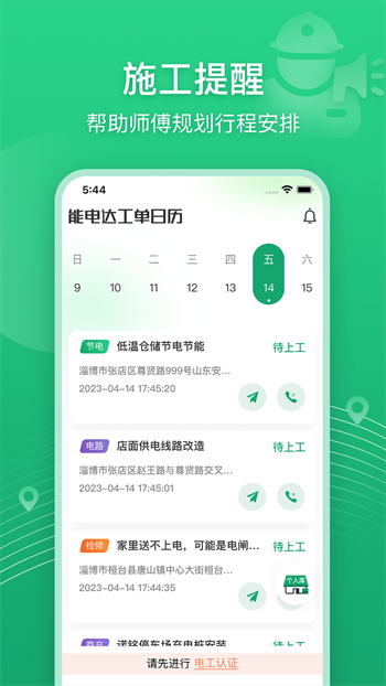 能电达app是一款专门为电工师傅打造的手机软件,提供了快速便捷的抢单维修手机服务,操控简单,功能齐全,用户可通过微信小程序下单,匹配合适的电工师傅进行服务,极速方便,价位也是同行最低,每日还有优惠折扣拿,下单立享,绝对靠谱,同时,新能源和智能化相关业务,拓展服务范围,提供更多元化的服务体验,找本地最好的维修师傅就来能电达!
