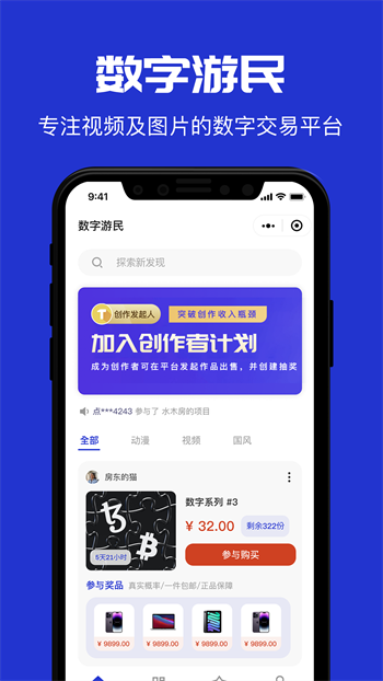 数字游民app是一款专门为摄影师设计的数字交易手机软件,致力于为摄影爱好者和专业摄影师提供一个安全、高效、便捷的作品数字交易平台,集成了多种实用功能,让用户可以随时随地上传、展示、出售自己的摄影作品,并通过数字化技术进行版权保护,保障作者权益,打破工作和工作地点间的强绑定关系,达成地理位置和时间自由,实现工作不做班也有收入,数字是工作方式,游民是生活状态!