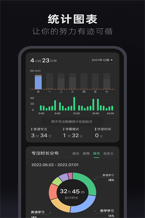 1、内置了多种实用功能,如悬浮时钟、小组件、番茄钟、倒计时、学习计时器、白噪音、打卡、倒数日、专注统计等。