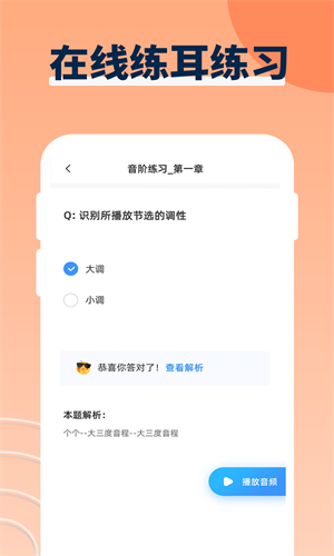 1.包含多种不同的练习模式,包括听音辨调和声配合旋律复述,满足用户不同的学习需求,让训练更加全面贴合实际。