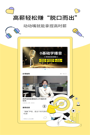 快学新副业兼职赚钱app是一款非常简单的关于配音学习的课程辅导的软件,这里是专为成年人的兼职进行设计的,这里会实时的推荐最新的配音相关的资讯的,为用户可以更好的阅读进行关注,所有的课程内容都是由专业人士提供,教授如何利用声音为自己赚取收入。