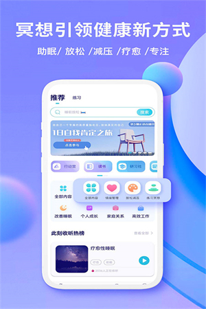 2、除了正念冥想指导和呼吸冥想训练,还有冥想睡眠音乐、大自然声、白噪音、睡眠故事、助眠音乐等丰富的冥想选择。