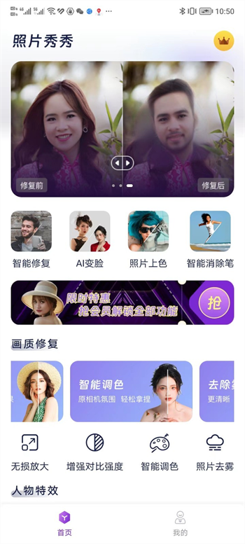 照片秀秀app是一款手机照片编辑软件,使用领先的原创图像生成技术打造的在线照片画质修复的工具,操控简单,功能齐全,永久免费,好用有趣,只需要从手机中选择模糊的照片提交处理,就能轻松获得清晰的好照片了,同时,就在这里,还有更有绘画 、变脸等丰富玩法,满足你的个性化需求,体验更多黑科技,别再犹豫了,一起秀秀照片吧!