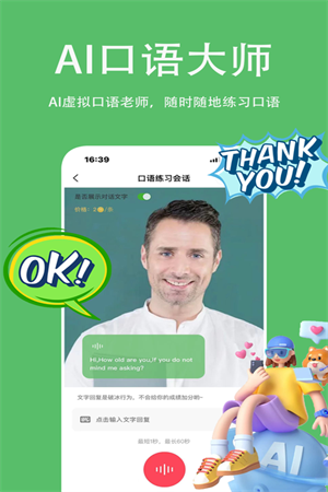 2、支持用户在任何时间和地点进行英语口语练习,帮助用户更好地利用碎片化时间来提高口语。