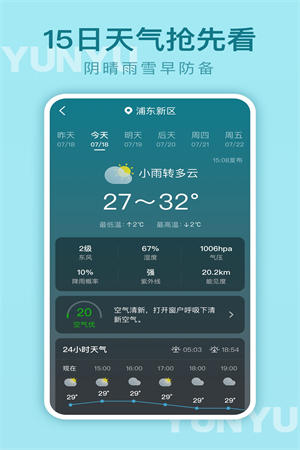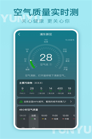 云雨天气app是 一款专为天气进行打造的预测工具,能够为用户提供精准度更加高的预测服务,让用户在家中也能享受到出门前获得天气信息的便利。在这里,您不仅可以随时掌握近15天的天气情况,还可以通过我们的空气质量实时监测功能了解该地区的空气质量状况,从而更好地保护自己的身体健康。