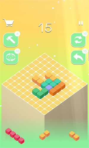 1.将不同颜色不同形状的方块内容放置到平台上,能够无限制进行畅享体验对应优质有趣的消除挑战。